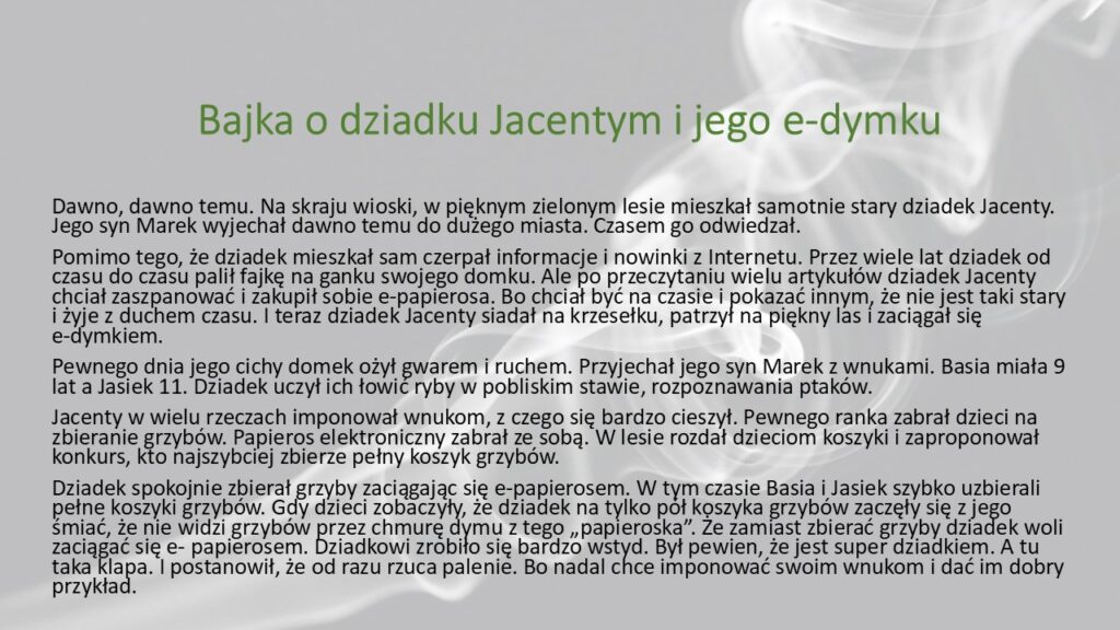 Kolejna bajka w ramach projektu Zagrajmy w „Wielka ściema E- papierosy”. – zadanie publiczne współfinansowane ze środków Województwa Podkarpackiego – Regionalny Ośrodek Polityki Społecznej w Rzeszowie.