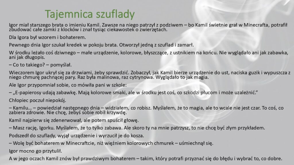 Bajka „Tajemnica szuflady” w  ramach projektu Zagrajmy w „Wielka ściema E- papierosy”. – zadanie publiczne  współfinansowane ze środków Województwa Podkarpackiego – Regionalny Ośrodek Polityki Społecznej w Rzeszowie.